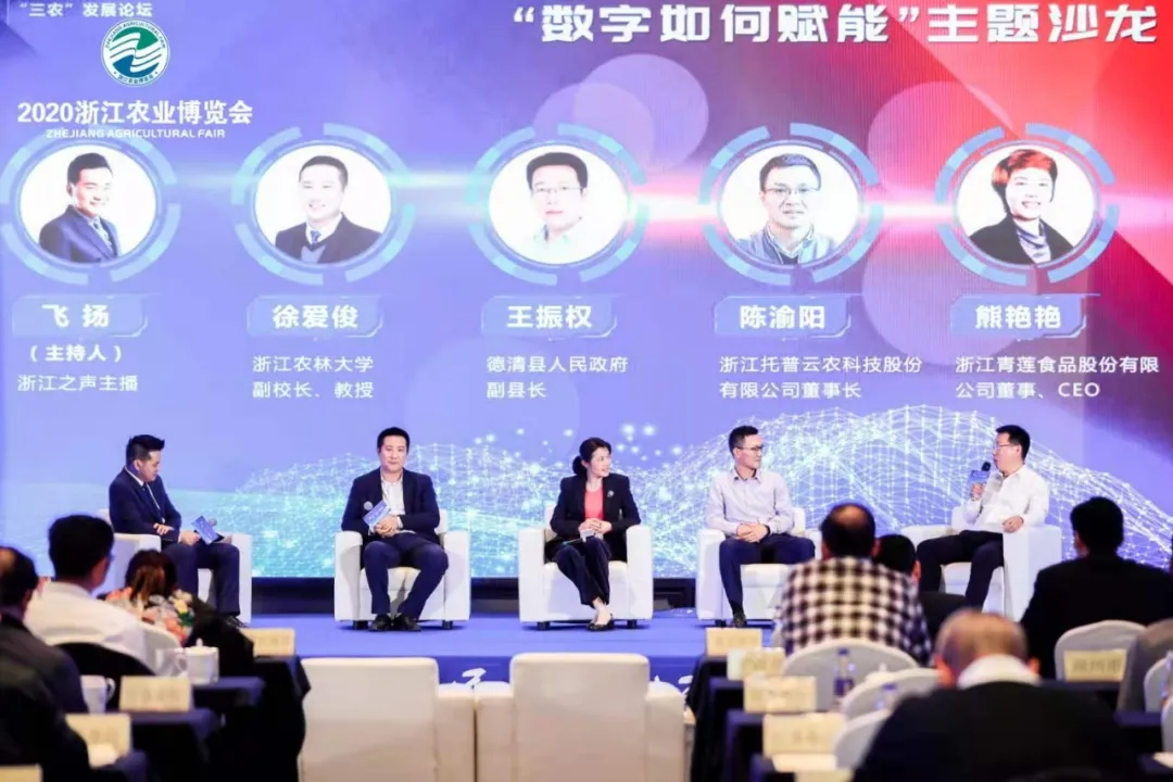 論壇還組織主題沙龍活動,邀請浙江農林大學副校長徐愛俊、德清縣人民政府副縣長王振權、浙江托普云農科技股份有限公司董事長陳渝陽、浙江青蓮食品股份有限公司董事、CEO熊艷艷等政產學研代表圍繞“數字技術如何賦能農業”這一主題展開深入探討交流。