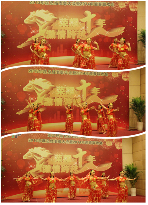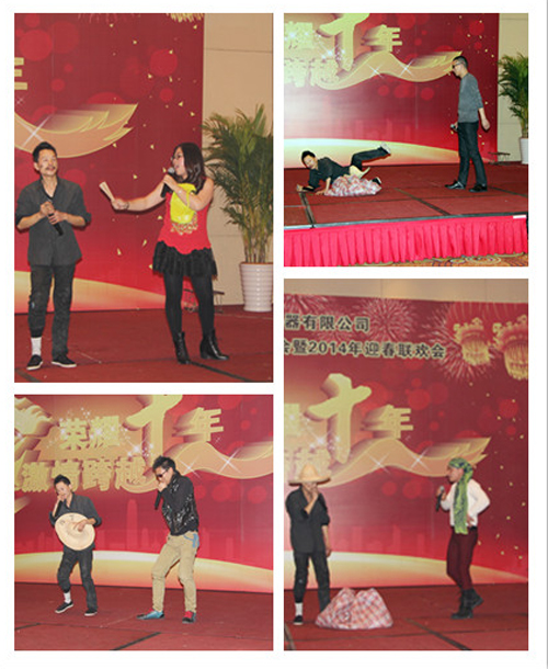 稍后,在席間一陣熱烈的掌聲中,晚會正是進入節目表演部分。總經辦一支歡樂逗趣兒的舞蹈《動起來》由陳總、朱總、張總、羅經理帶領一眾老員工幽默開演。銷售部周藍艦、張銀玉深情對唱《小酒窩》,在大家的叫好聲里,兩位托普天王天后甜蜜擁抱。祥鼎團隊的小品《賣土豆》詼諧風趣、引得席間眾人拍手稱贊,一片叫好。由張銀玉領跳的《印度舞》向所有托普家人展示了靈動美艷的異域風情,將整臺晚會的歡樂氛圍推向高潮。