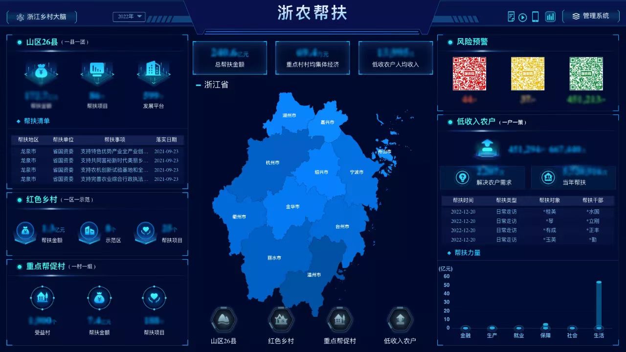 通過長效機制防返貧,保證脫貧成效持續穩定發展,是國家鄉村振興局五年過渡期的主要任務。張桂華局長一行重點關注了浙江鄉村大腦和被評為2022年度數字社會系統“最佳應用”的浙農幫扶,肯定了浙農幫扶應用“輸血+造血”扶智長效機制,以及“一縣一團、一村一組、一戶一策”新型幫共體建設。張局長一行現場體驗了浙農幫扶針對低收入農戶群體的風險識別預警、干部幫扶、風險解除等應用場景。