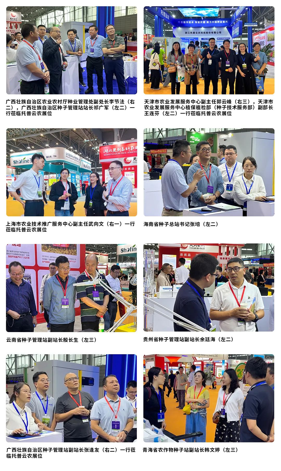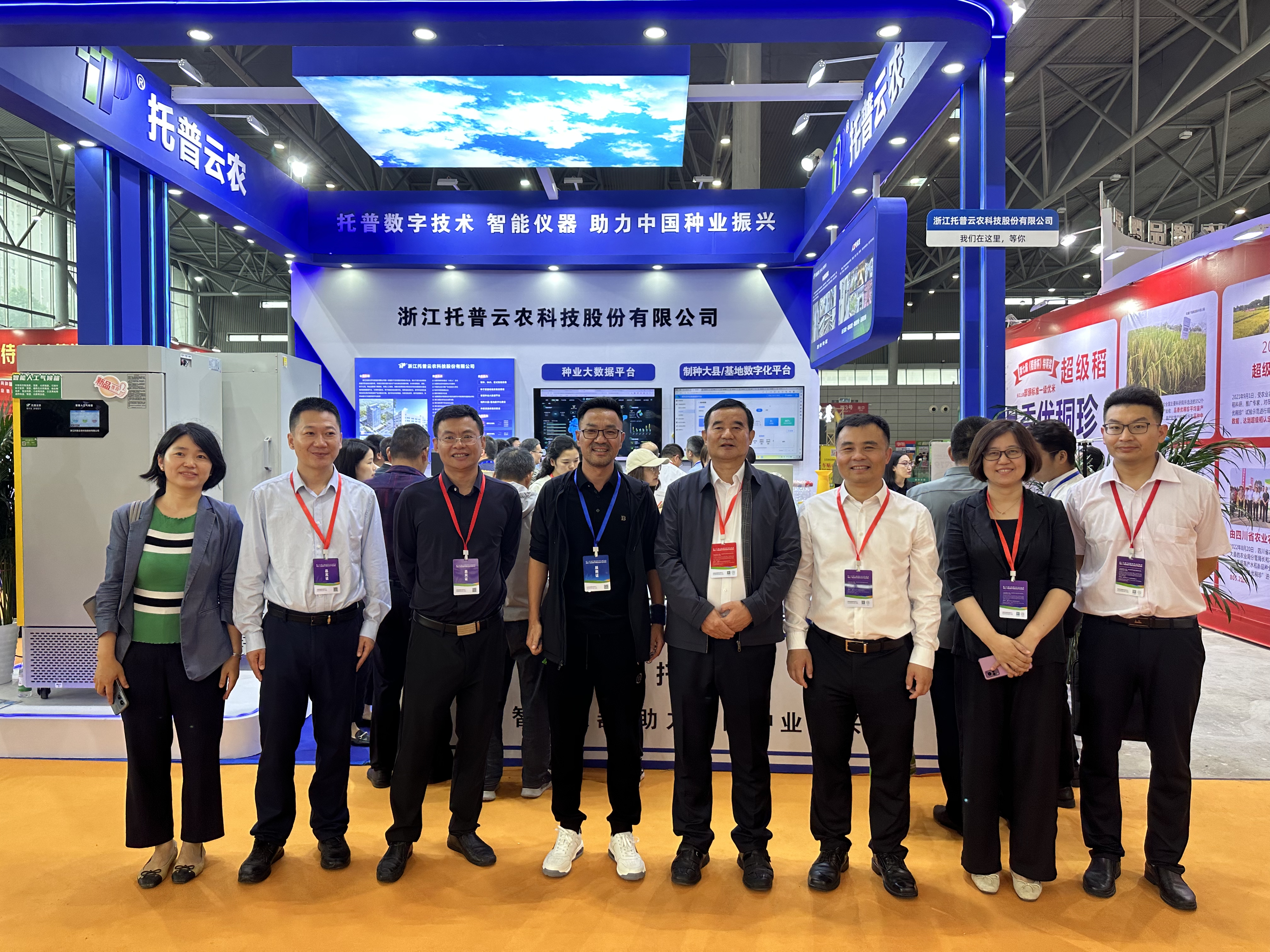 全國農技中心副主任劉信(右四),全國農技中心品種登記處處長邱軍(右三),全國農技中心種子檢驗處處長金石橋(左三),全國農技中心種業監測處處長張力科(右一),全國農技中心種子檢驗處副處長晉芳(右二),全國農技中心區試處副處長曾波(左二),全國農技中心農藝師馬文慧(左一)蒞臨托普云農展位