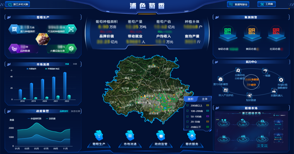 浦江農業農村局以“葡萄產業”為試點產業,依托數據、算法、模型等數字技術打造浦江葡萄產業大腦——浦色萄香,以“產業大腦+超級農場”為核心,圍繞葡萄全生命周期全流程管理,構建葡萄生產、市場流通、政府監管、葡農服務四大場景應用,賦能葡萄生產、流通、銷售全環節。