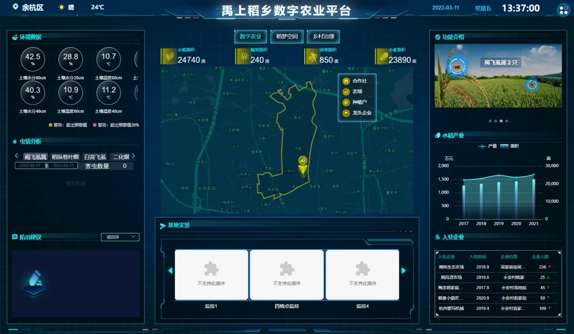 諸暨市山下湖鎮土壤肥沃良田萬頃,是諸暨市重點產糧地之一,為夯實糧食產能基礎,山下湖黨委政府依托“一心引領、一線串聯、五區聯動、多點輻射”的理念,聯合浙江森特以數字賦能,打造數字化綠色農田示范區,通過實時檢測,掌握蟲情、苗情、墑情、土壤肥力等數據,為農田生產提供預警分析;在決策端,浙江森特搭建山下湖綠色農田生產數字管理平臺,以數字化技術對農作物進行產前數據分析、產中數據檢測預警、產后數字歸集,通過對數據的匯集利用,科學規劃農田,提高管理效率,實現農田生產的提質增效,綠色發展,提高種植效率。
