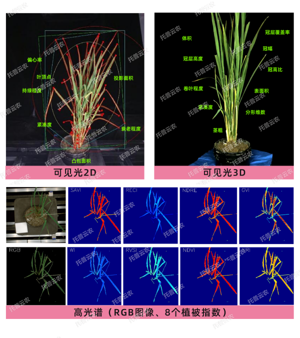 高通量植物表型采集分析平臺(tái)集成了可見(jiàn)光二維、可見(jiàn)光三維、高光譜等成像模塊,整合多種傳感器,能夠獲取植物全生育期高通量表型信息,覆蓋不同生境下植物器官、單株、群體的形態(tài)、生理等120多種表型指標(biāo),超越國(guó)外主流同類(lèi)型裝備。