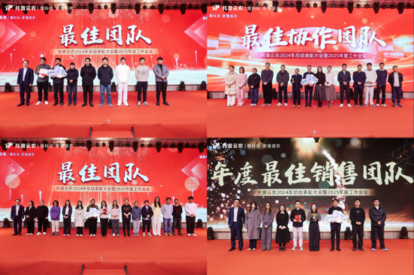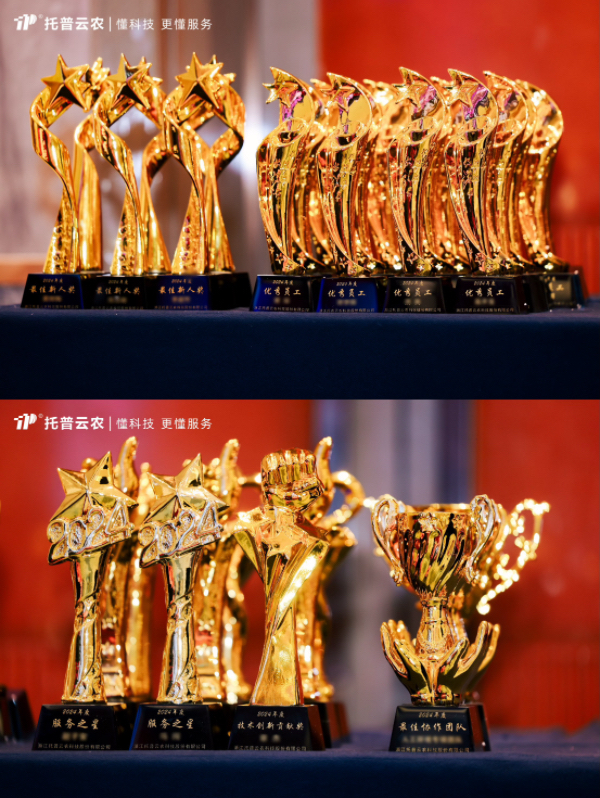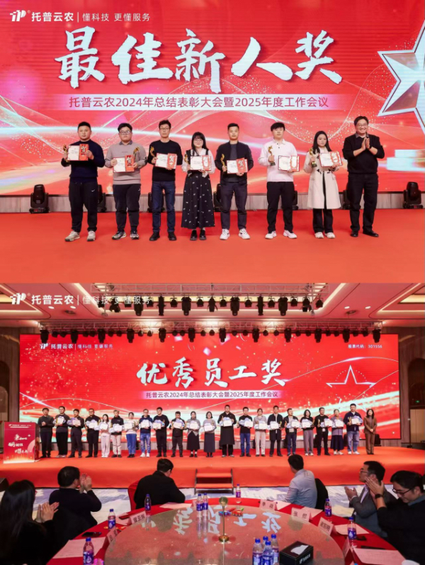 過去的2024年,托普云農人才輩出,各領域先進典型不斷涌現。本次年會,公司為2024年度在各個崗位上表現卓越的個人和團隊,頒發了包括最佳新人、優秀員工、服務之星、技術創新、銷售精英、最佳團隊、總經理特別獎、托普特別貢獻人物等在內的十余個獎項。他們以卓越的表現詮釋了何為托普精神,用堅持照亮了全體員工的奮進方向。表彰儀式氣氛熱烈,公司對這些優秀員工及團隊的高度認可,贏得了現場陣陣掌聲。