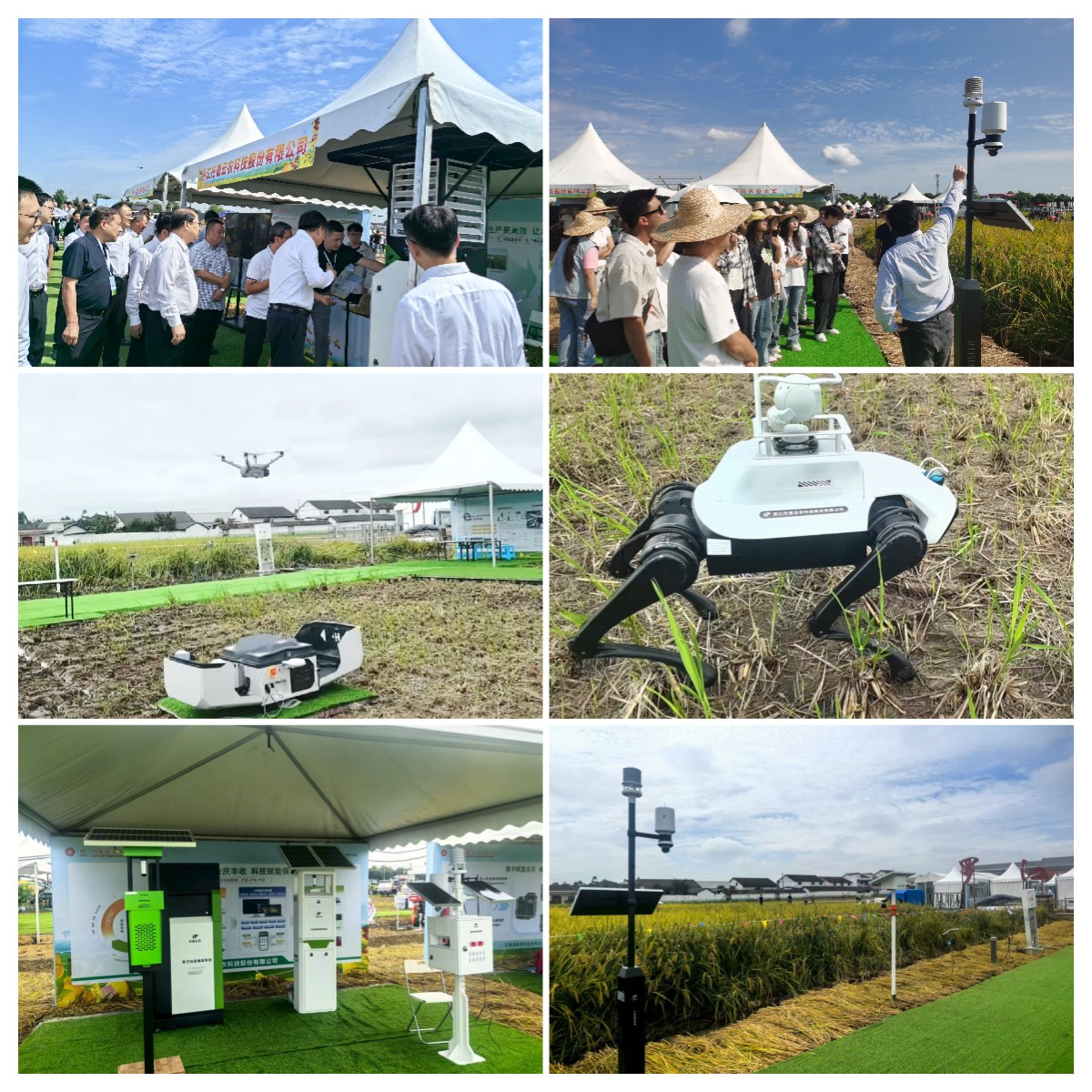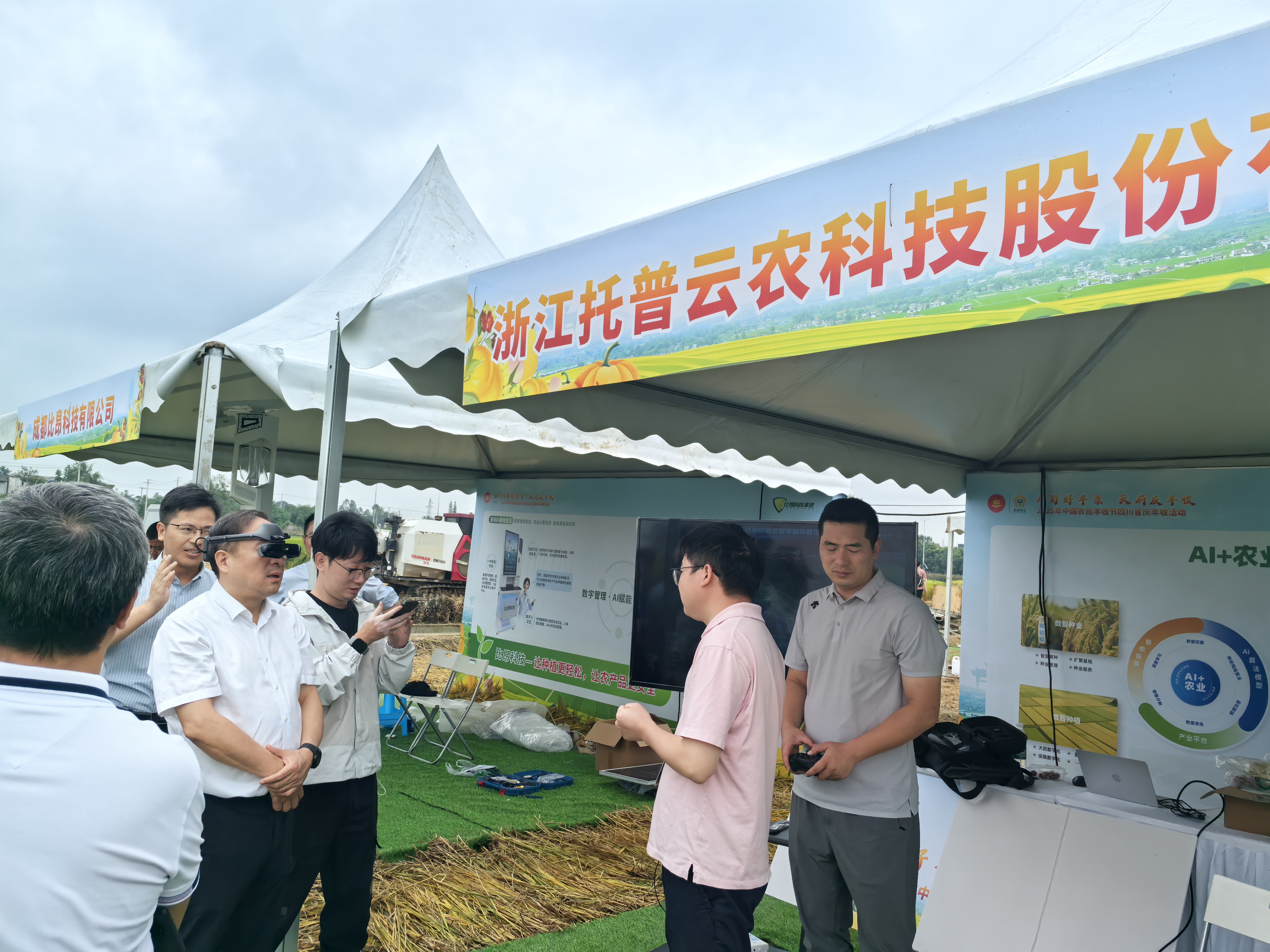 在智慧農業示范體驗區,托普云農自主研發打造的AI智能體「問稷」,以及AI+無人機、AR智能眼鏡、田間機器人(狗)等一系列數智化“新農具”整齊陳列,工作人員正現場演示設備操作流程,吸引了眾多嘉賓駐足觀看。其中,幾位前來考察的領導對造型輕便的 AR 眼鏡格外感興趣,主動詢問功能并試戴體驗。據介紹,AR 眼鏡能讓農技人員實時獲取作物生長狀態、病蟲害情況;田間機器人(狗)可快速采集傳輸地面環境數據;結合「問稷」AI 智能體,能為田間生產管理提供精準農事操作建議。