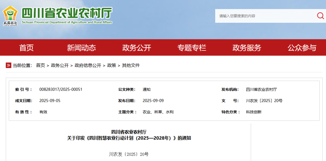 近年來,四川省錨定 “打造新時代更高水平‘天府糧倉’” 目標,持續推進糧食穩面增產,深化 “天府糧倉?百縣千片” 建設。為進一步為“天府糧倉”注入數智動能,四川省農業農村廳近日印發《四川智慧農業行動計劃(2025—2028 年)》(以下簡稱《計劃》),提出到“瞄準打造新時代更高水平“天府糧倉”,以推進物聯網、衛星遙感、人工智能、大數據等現代信息技術在農業農村領域全方位全鏈條普及應用為主線,加快推進四川農業農村現代化”,為四川智慧農業發展畫出清晰 “路線圖”。