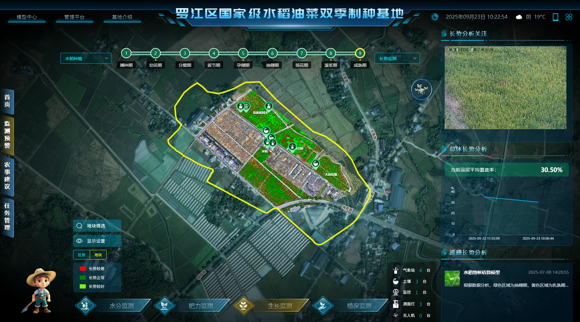 以水稻生長周期為主線,結合托普自主研發的水稻生育期預測、變量灌排、變量施肥、變量施藥等模型算法,摸清作物的生長規律,為大田精細化管理提供決策支撐。