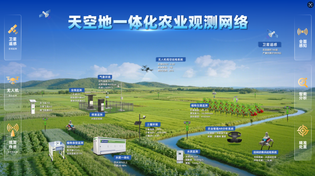 通過融合衛星遙感、無人機低空遙感、智能機器人(狗)、農情監測站、高精度農業傳感器等智能裝備,構建“空天地”全方位監測體系,全面實時高效采集農田環境、水分、肥力、病蟲害、作物生長等信息。