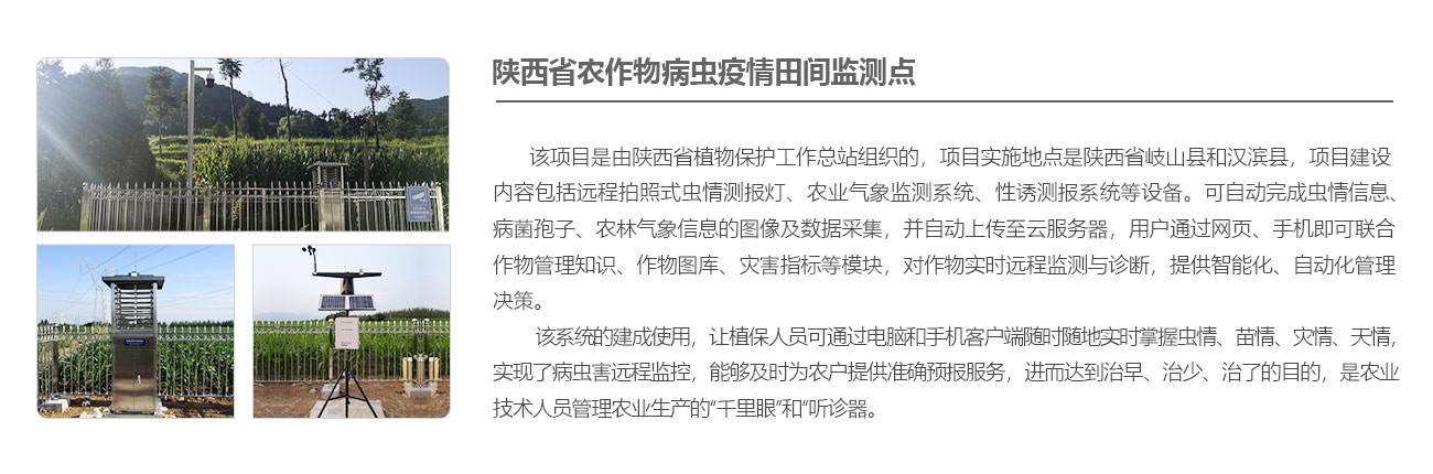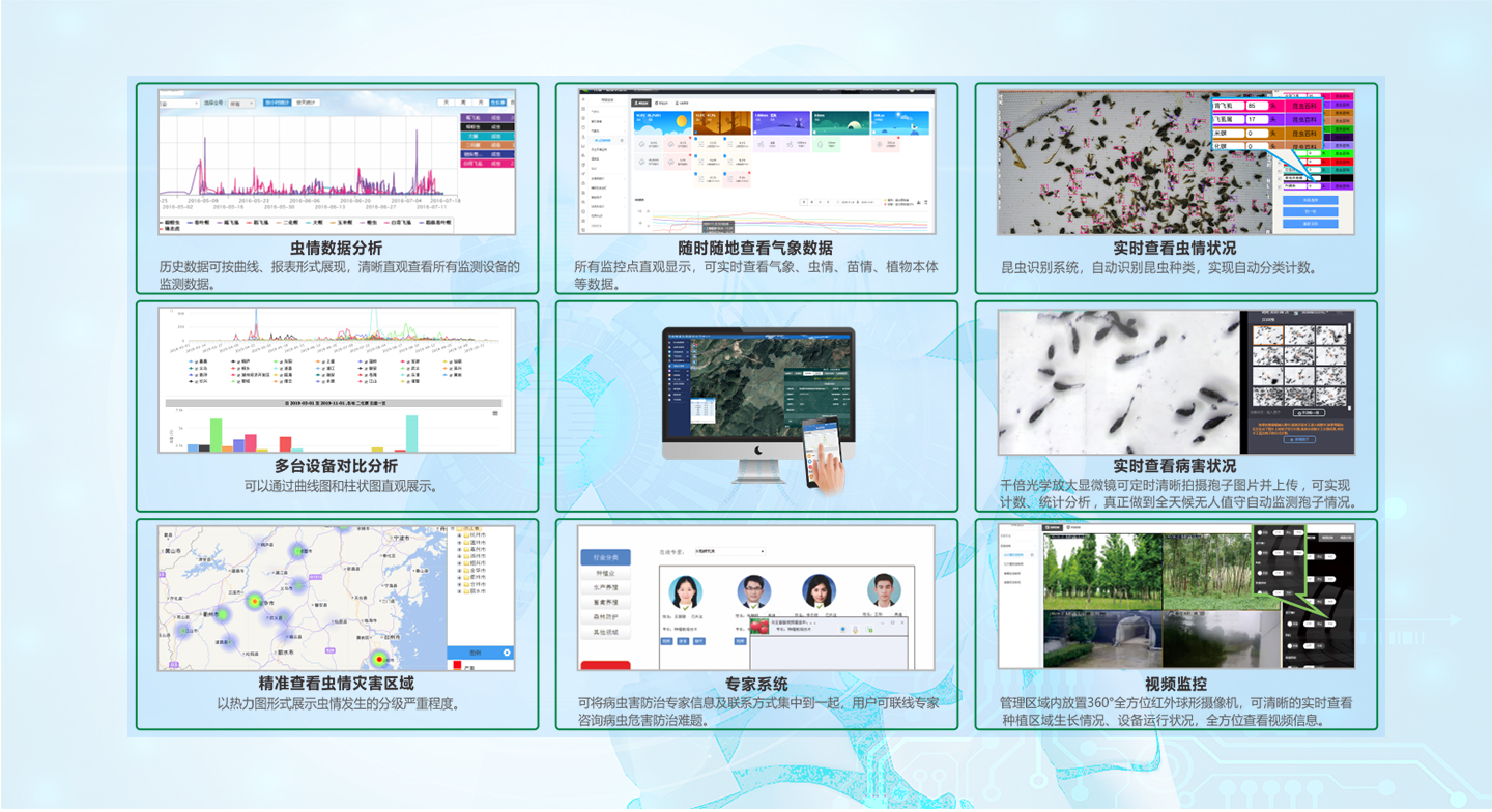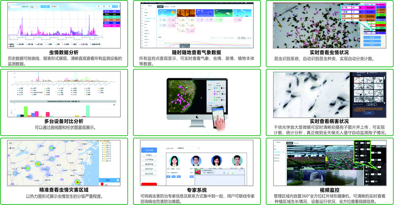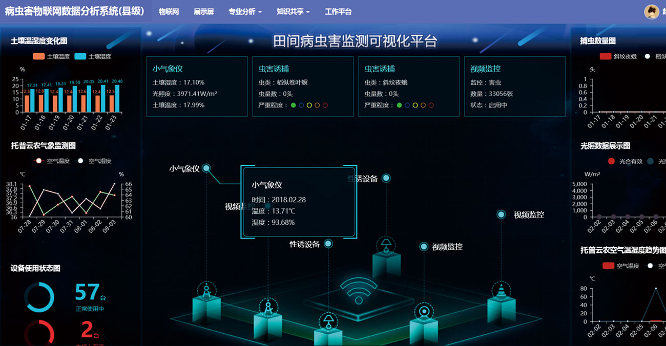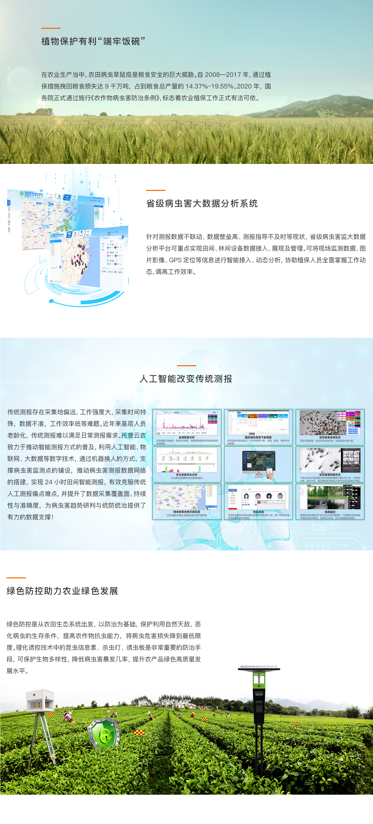 本系統是根據縣級病蟲害監測預警現有工作體系,重點實現田間、林間智能物聯網設備數據接入、展現及管理;實現國家、省級任務自動上報,鄉村基層測報點管理,建立屬地病蟲害檔案;對數據自動統計分析處理,提供預警支持;通過手持移動終端,可現場進行監測數據采集及實況拍照、影像報送及GPS定位。系統采用智能接入、動態分析等可視化展示先進技術,協助縣級植保人員全面掌握工作動態,調高工作效率。