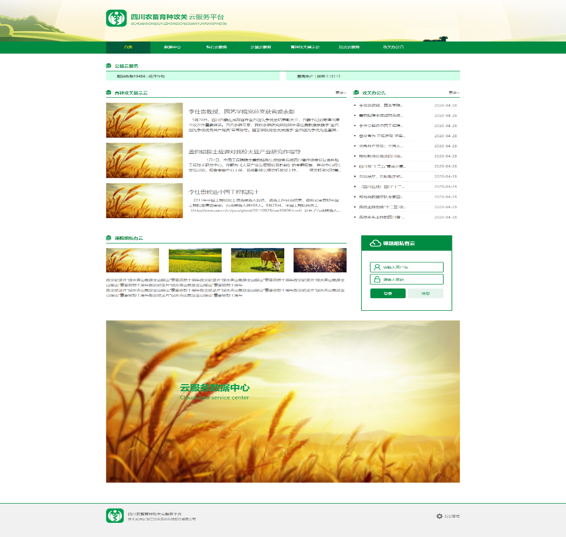 四川農畜育種攻關云服務平臺服務于四川省農業科學院農業信息與農村經濟研究所,平臺以育種攻關為依托,實現科技產業化導入,推動育種攻關服務能力提升。平臺功能涵蓋種質資源管理、育種平臺管理、病蟲草害測報、農事指導、儀器設備共享管理、大數據分析等服務